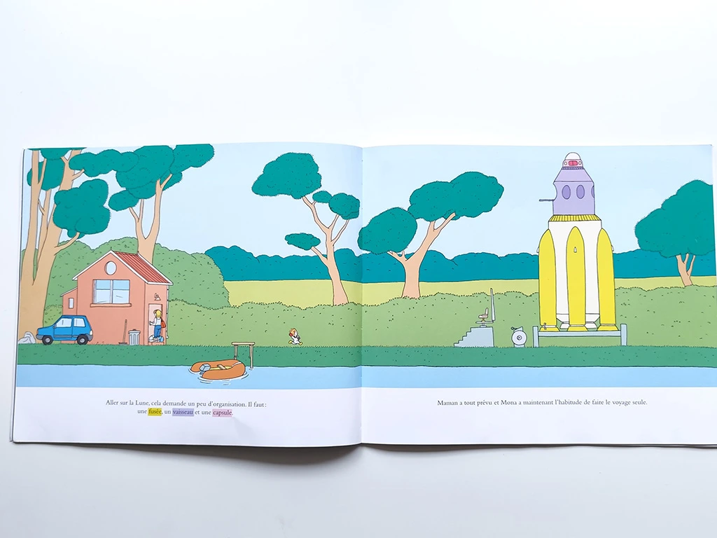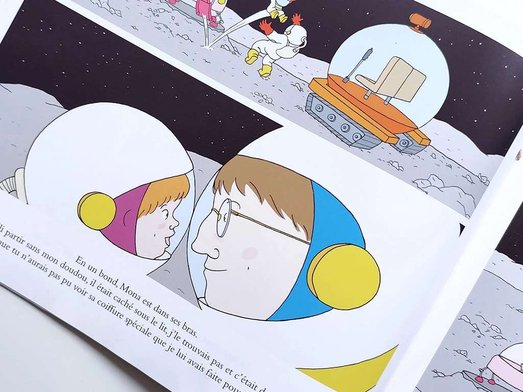 L’important est d’aborder ces moments avec beaucoup de douceur, en restant à l’écoute. Les histoires sont également un excellent moyen d’anticiper certaines peurs. Un enfant qui prend le train pour rejoindre l’un de ses parents, par exemple, pourra facilement s’identifier à Mona dans sa fusée… et même être fier de raconter que lui aussi voyage, à toute vitesse, avec les paysages qui défilent.