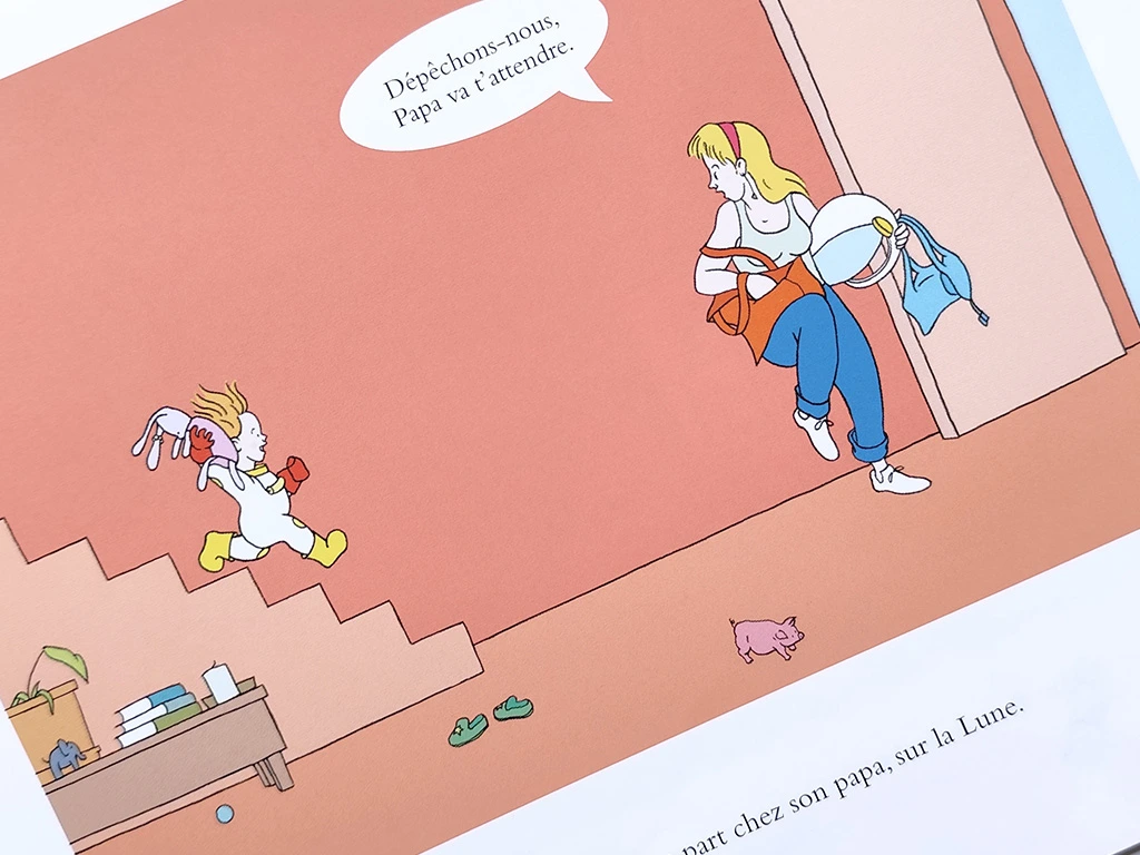 Nous suivons l’histoire de Mona, une petite fille pour qui cette journée est particulière : elle part chez son papa, sur la Lune. Le voyage demande un peu de préparation, mais Mona a l’habitude de faire le trajet seule, et sa maman s’occupe de tout.