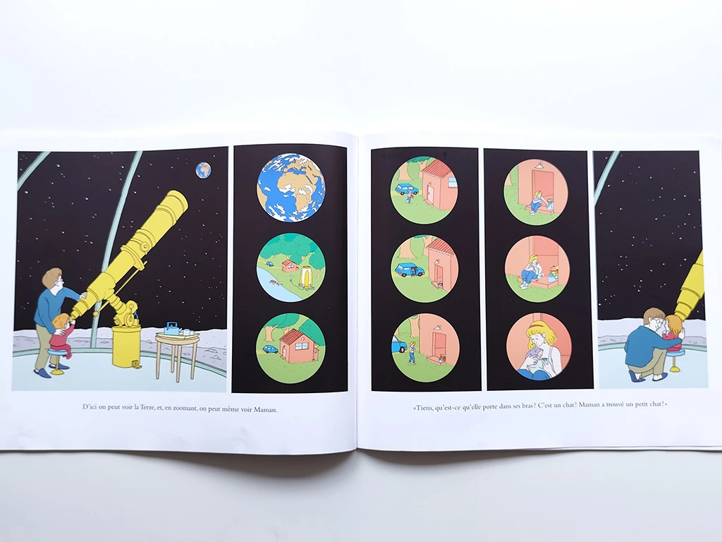 La grande force de cet album réside dans la métaphore du voyage Terre–Lune pour symboliser la maison de maman et la maison de papa. Beaucoup d’enfants vivent cette situation, et il n’est pas toujours facile de trouver les mots pour l’expliquer.