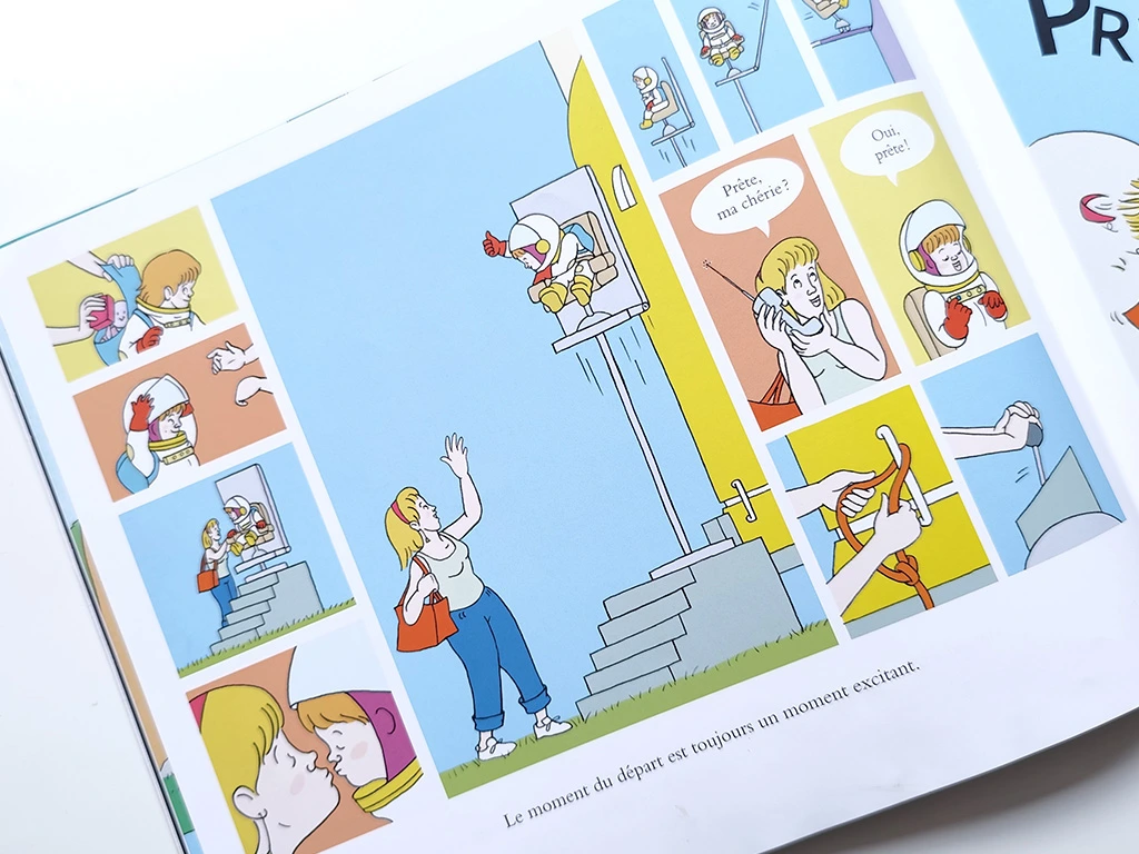 L’accent est particulièrement mis sur le voyage entre les deux maisons. Les illustrations, très réalistes, regorgent de détails sur le voyage spatial : le décollage, les capsules, l’alunissage, la notion d’apesanteur, la base lunaire, puis le retour sur Terre avec les parachutes qui se déploient pour un atterrissage en douceur dans la mer.